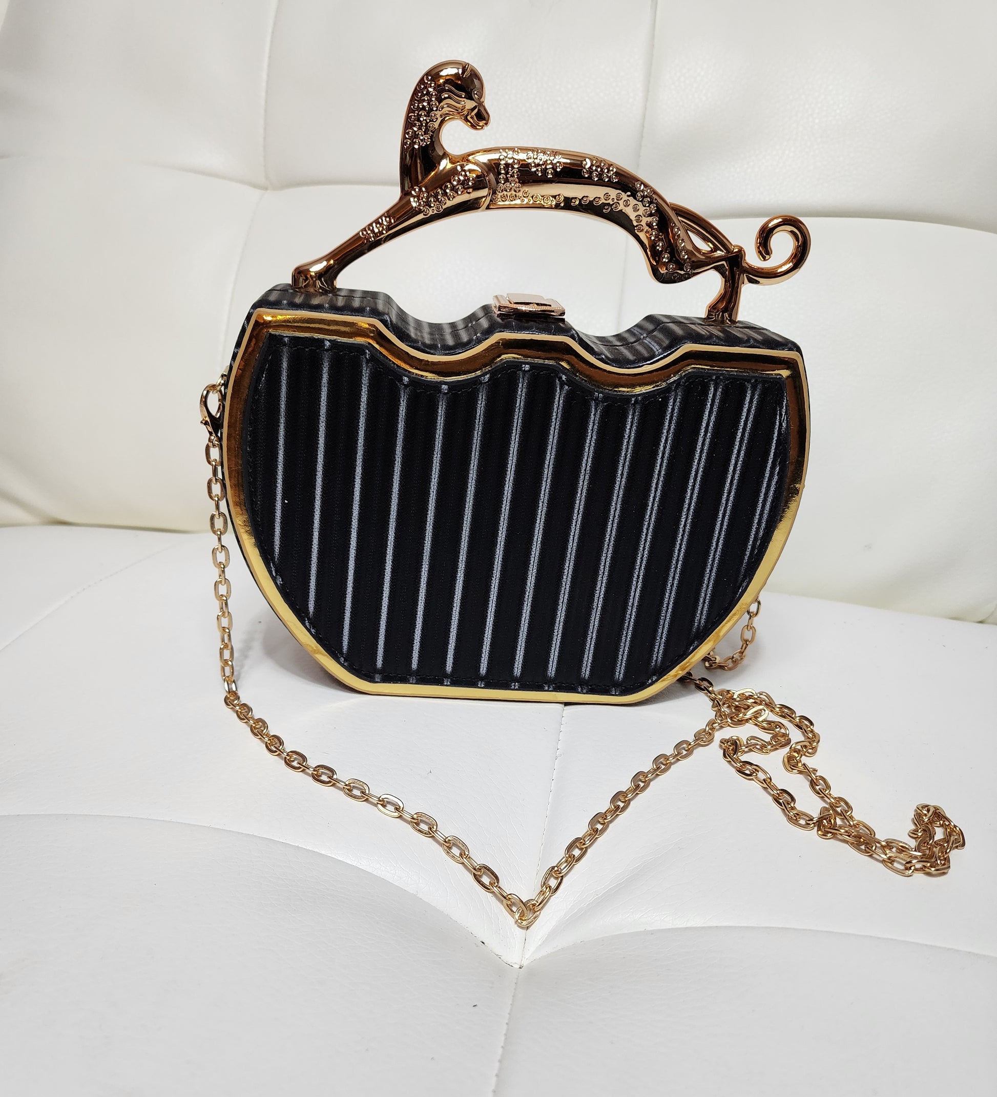 This chic bag is a fashionista's dream. You will love the structured body that features faux gold hardware with a top latch closure. The handle resembles a jaguar and feel free to rock it with or without the chain strap. The open compartment is spacious for a small bag. Available color: Black