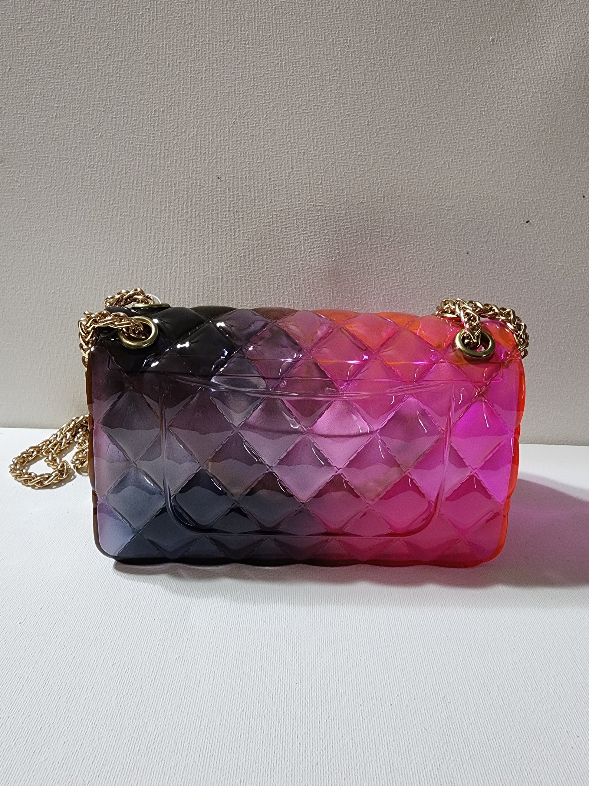 This small jelly clutch is a stylish addition to any look. It can hold your cellphone, wallet, keys, and other small essentials in style. It features a twist lock closure, goldtone hardware, and two, small inside open compartments. It's PVC in an ombre design and has an adjustable metal strap. Medium weight. Available colors: Green, Pink
