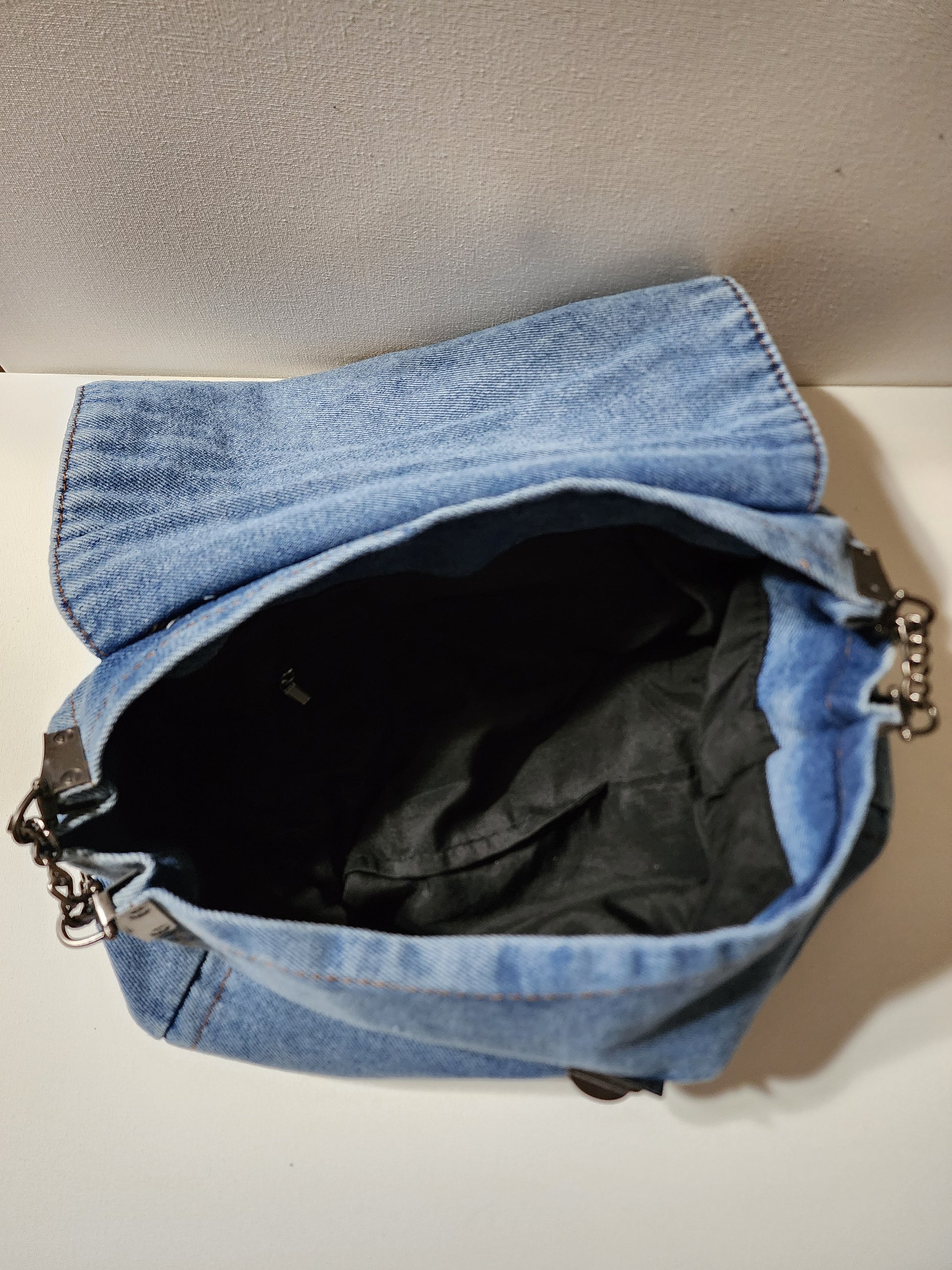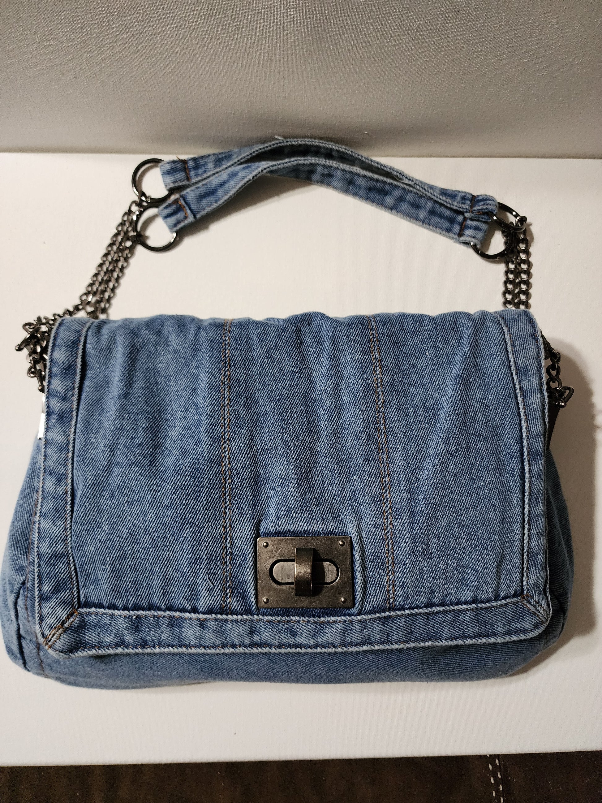 This denim bag is a closet staple. This casually chic handbag features double chain denim straps with a top flap and metal closure. It's very spacious open compartment will hold all your essential items. Available color: Blue
