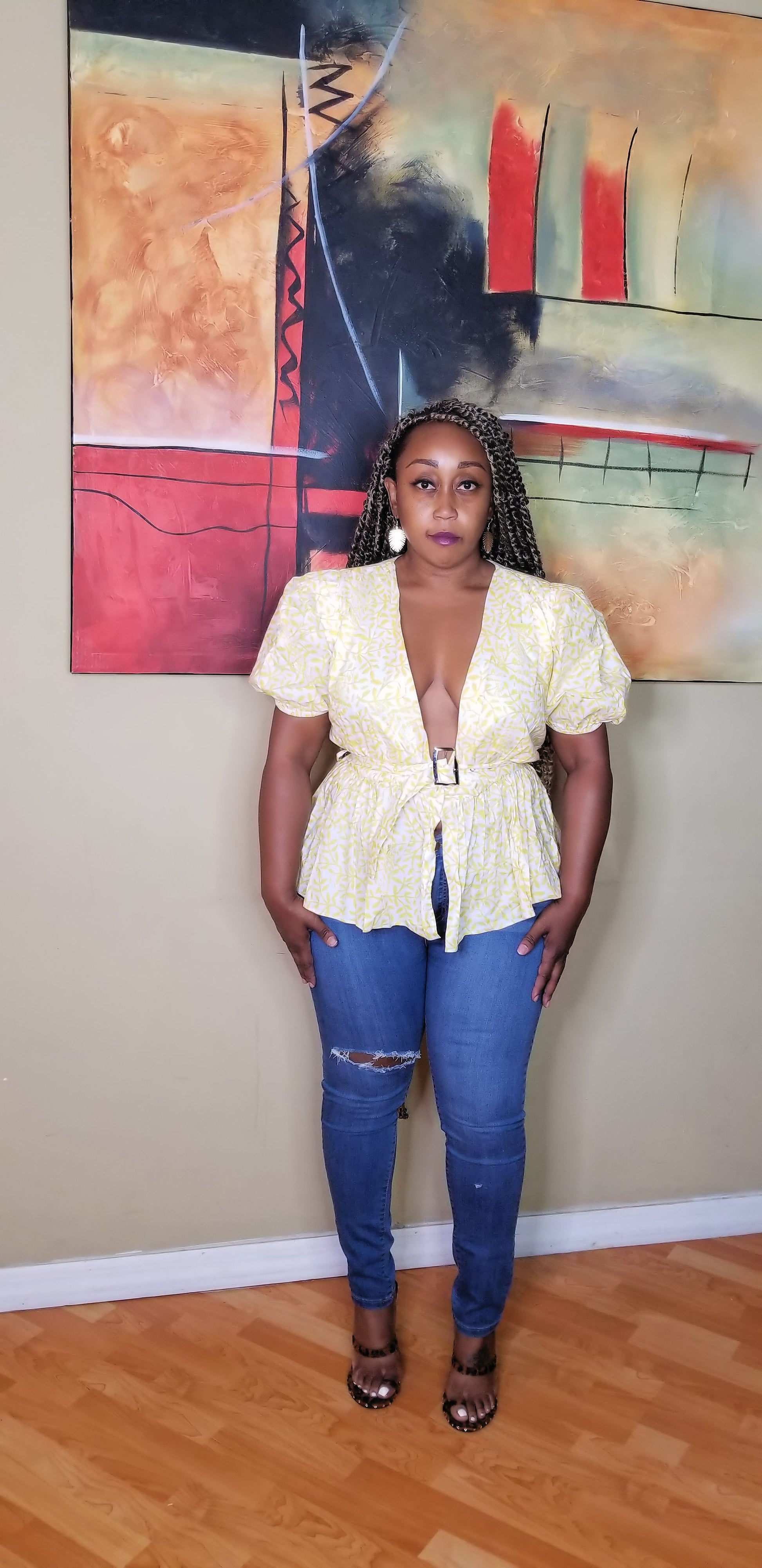 Bright and bold are the perfect descriptors for this chic top. We know you will look amazing rocking it to brunch, during a date, or grabbing lunch. It features, a deep wide v-neck bodice and an attached, adjustable belt and hidden snap closure. The waistline and sleeve ends are elastic. Self -100% Cotton, Partial lining - 100% Rayon. Hand wash cold. Do not bleach. Hang to dry. Women's size reference: S=4-6, M=8-10, L=12-14. Model wears size large. Available color: Yellow