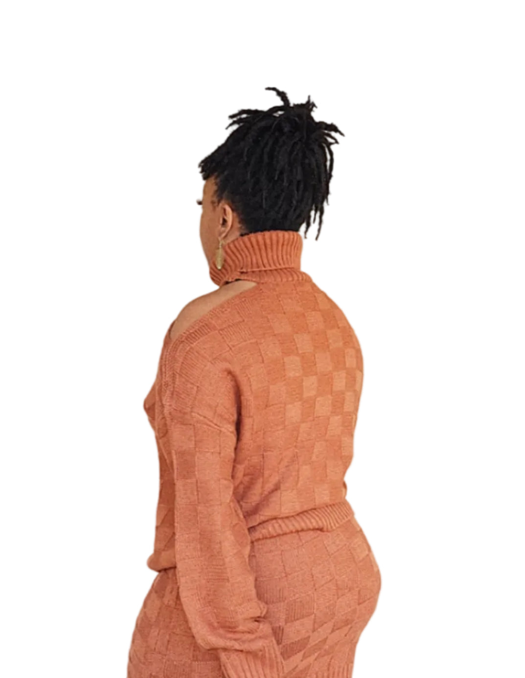 Cool Girl vibes only in this super chic skirt set. It features a knit top with bold turtleneck, an open slit on one shoulder, and long sleeves. Relaxed fit. The skirt is mini length and fits to the shape of your body. No closures. Moderate stretch.