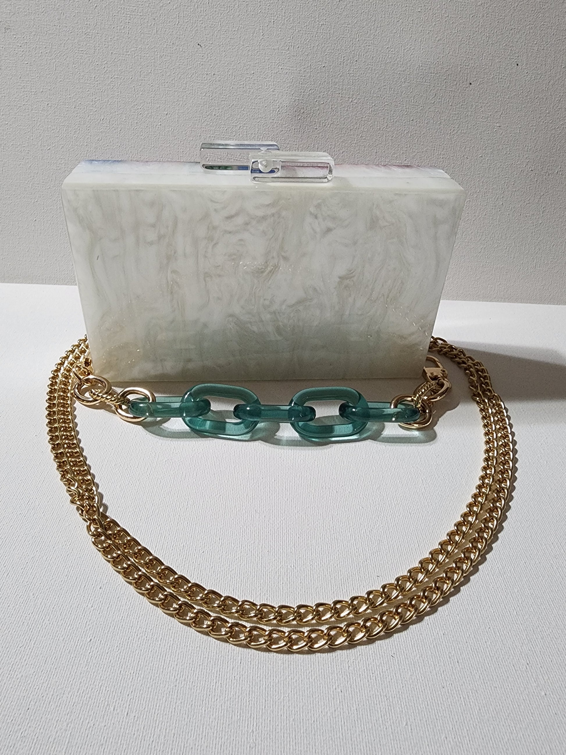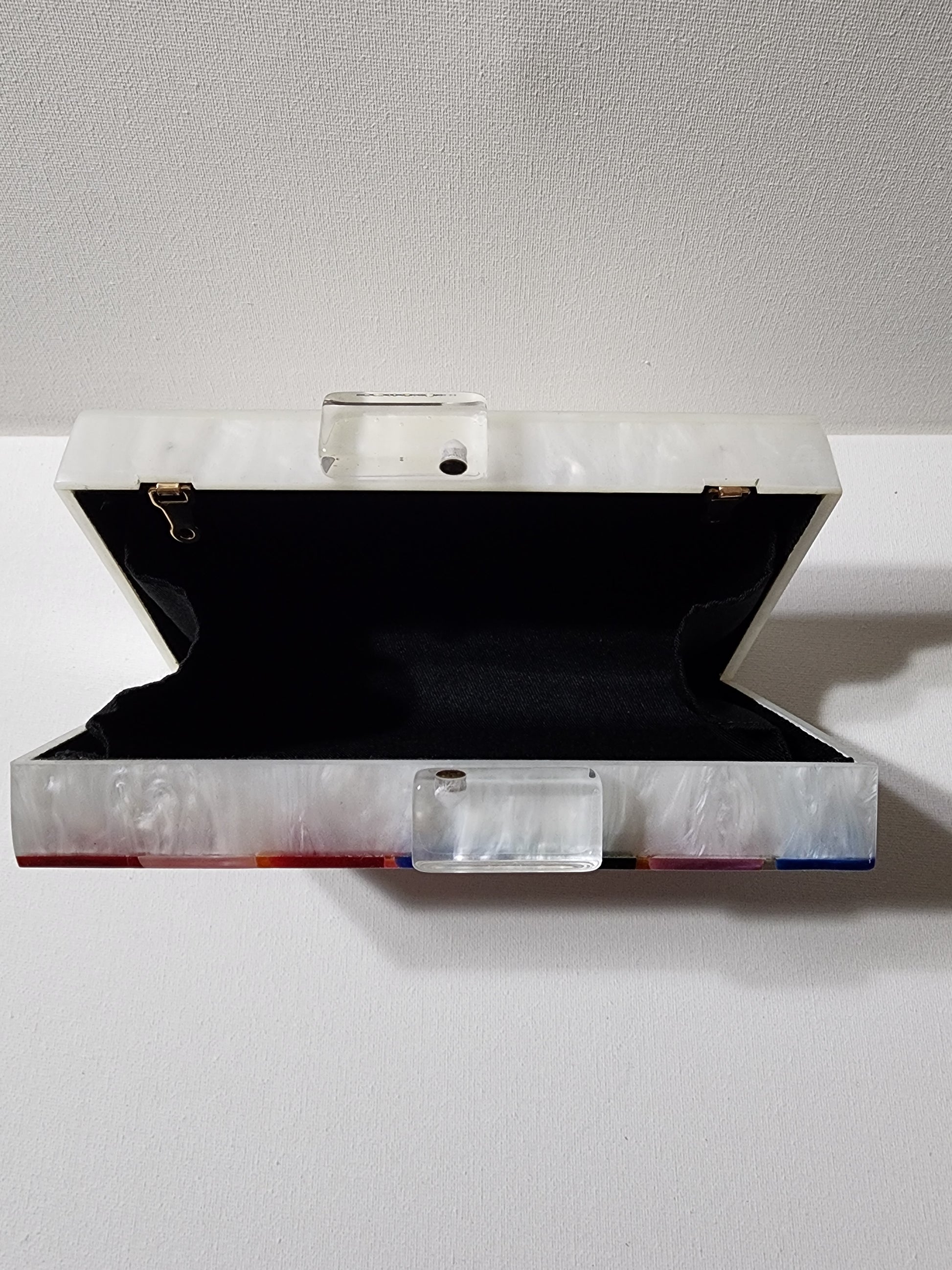 This bag is perfect for any event or a night on the town. It features a multi-colored marbling design in a box silhouette. It has a top magnetic closure and opens up to a moderately roomy interior and a slim sidewall pocket. Detachable gold and acrylic chain straps accompany the bag.