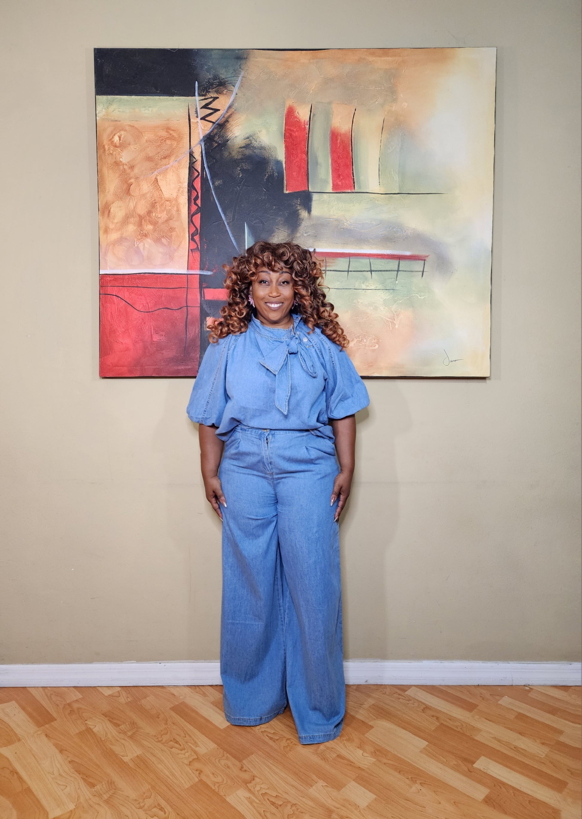 Get ready to make some major boss moves with this lovely, lightweight set. The top and pants are relaxed fit. The top features a multi button closure at the neckline, a bow, and voluminous sleeves. The pants are highwaisted with wide legs. There is an elastic band at the waist as well as a button and zipper closure.