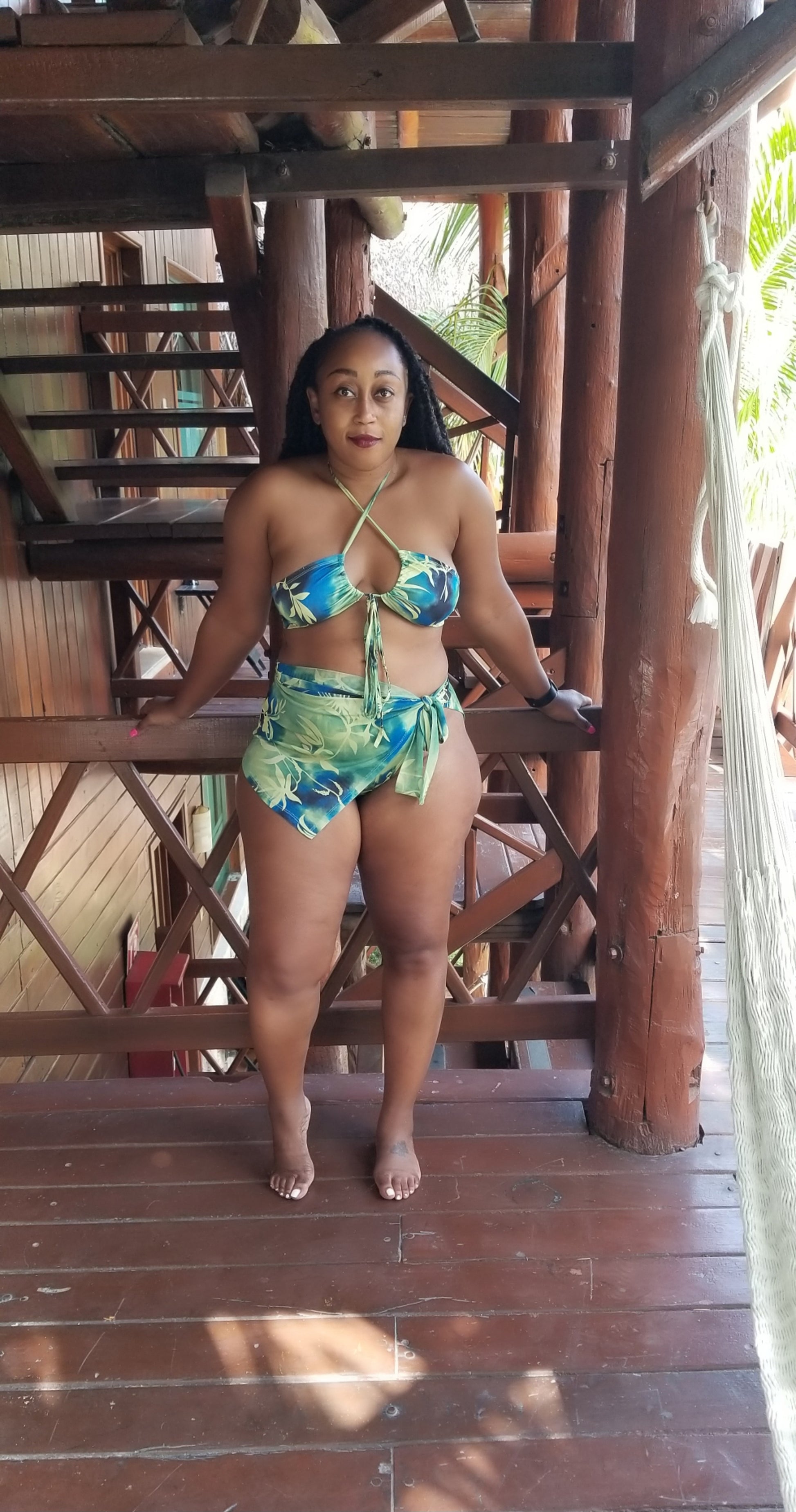 Our Green Machine swim set is the complete, stylish combo! It features a criss-cross halter top with a tie front and a latch closure across the back. The bottoms are full coverage with no closure. The cover-up skirt has a tie closure. Each piece has moderate stretch.
