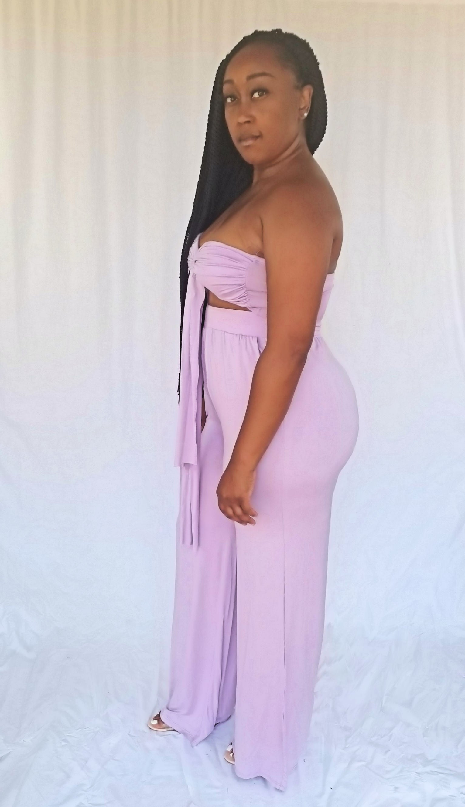 Let this two-piece take your look to another level! You will enjoy the versatility of the tie front, back shirred tube top. The top can be tied around your neck like a halter, around your shoulder for a Grecian look, and so many more fun variations. The wide leg pants feature pockets and an elastic waistband. No closures. Very stretchy. 95% Polyester 5% Spandez. Women's size reference: S=4-6, M=8-10, L=12-14. Model is 5'2" wearing size large. Available color: Lilac