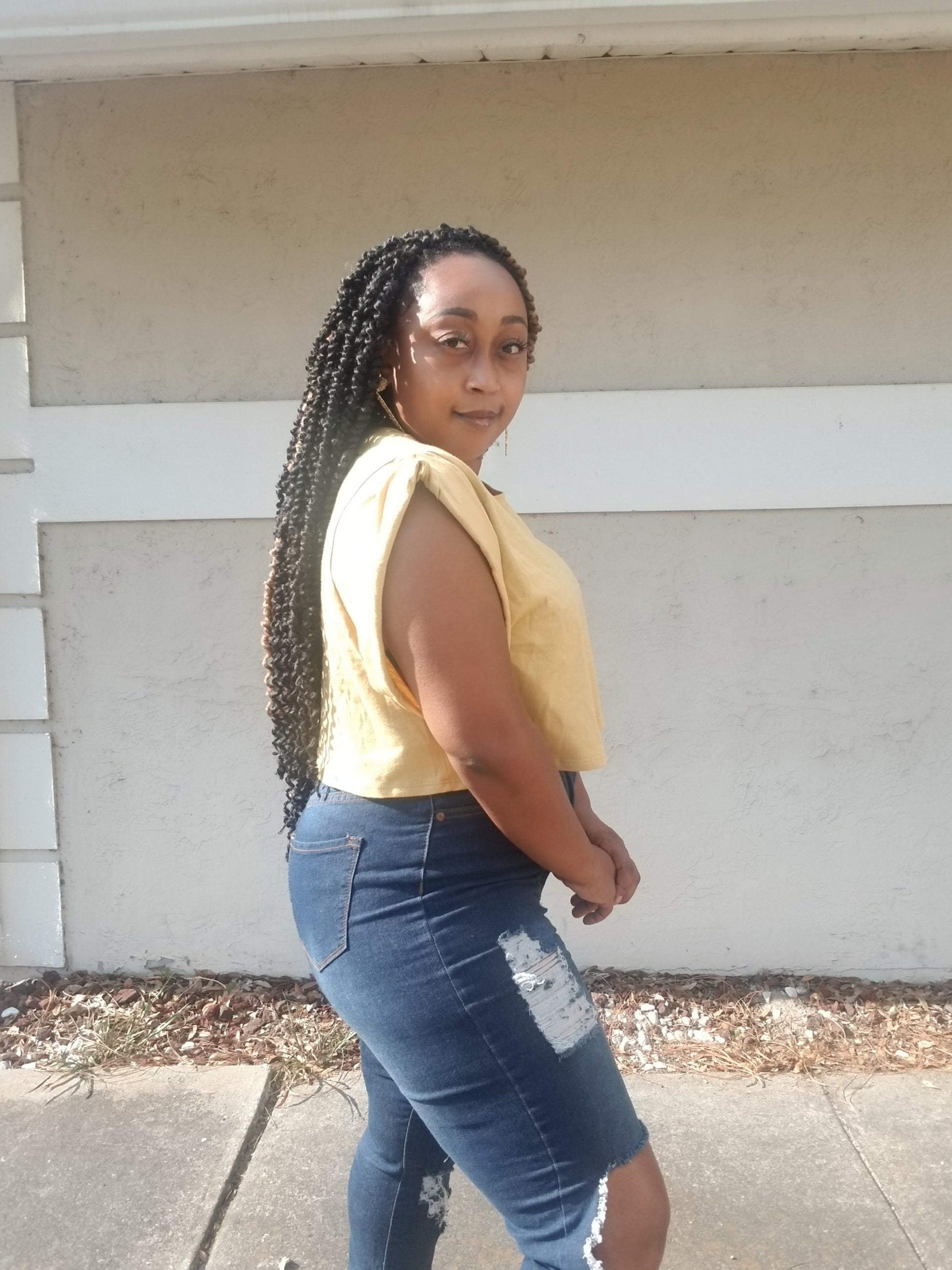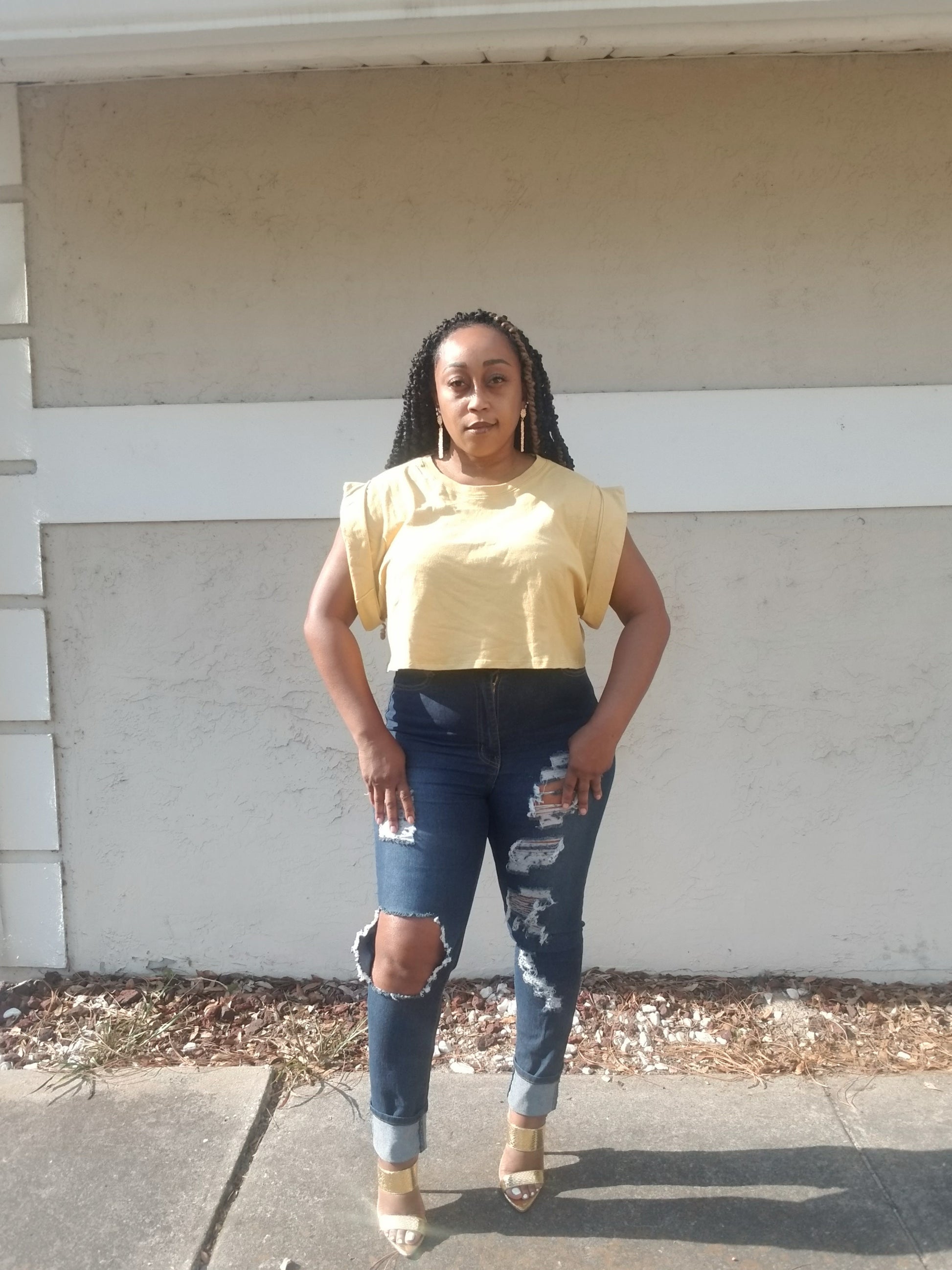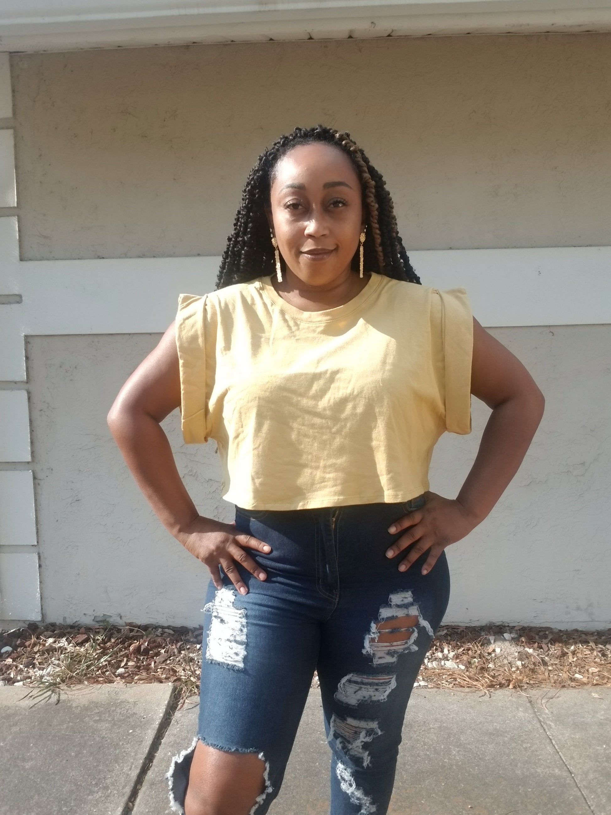 Check out the lovely design spin on this crop top. It features wide, kimono-inspired cuffed sleeves with a rounded neckline. A small front pocket rounds out the features. No closures. 100% Cotton. Women's size reference: S=2-4, M=6-8, L=10-12. Model is 5'2" wearing a size large. Available color: Mustard