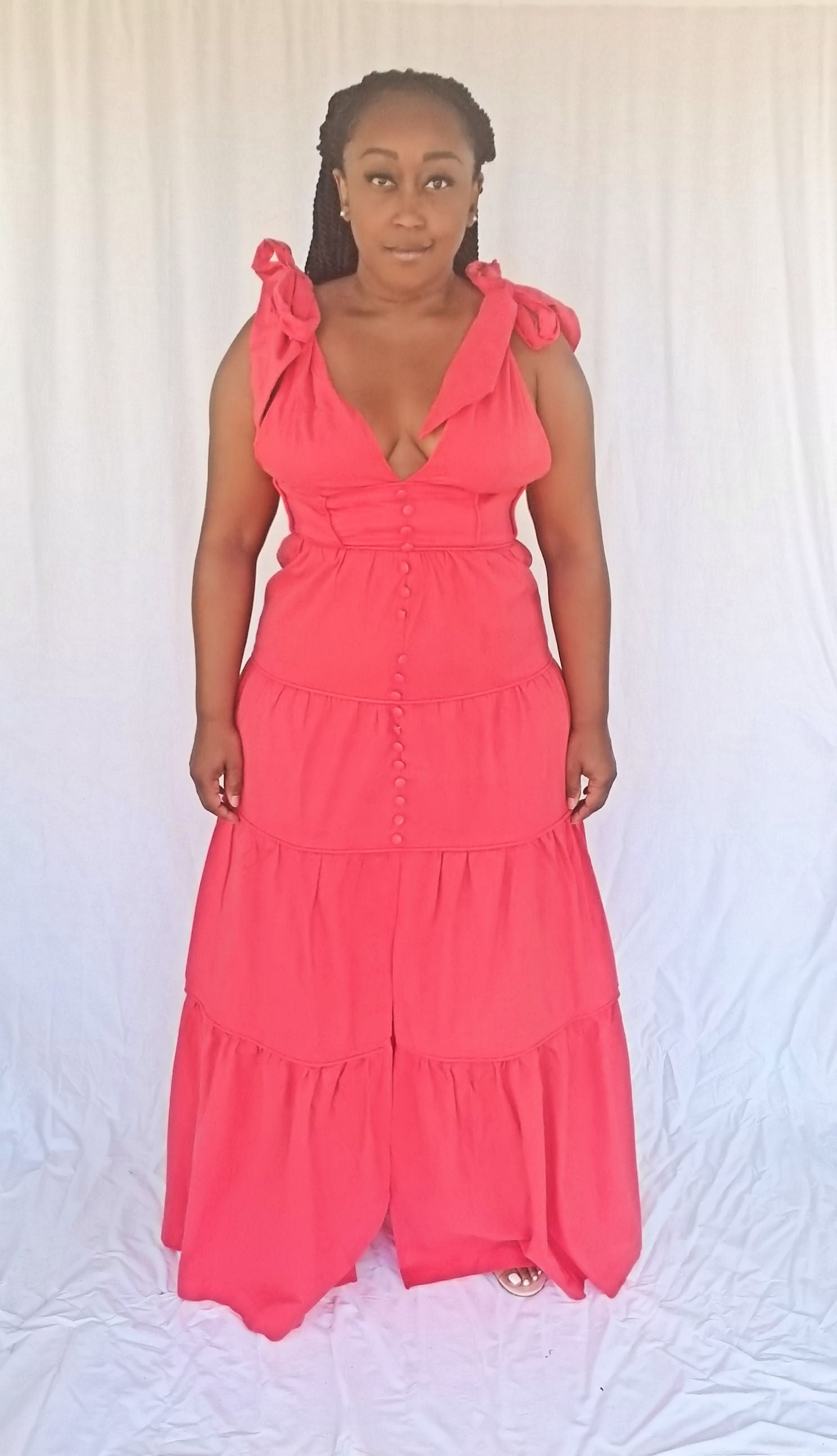 Feel like a beautiful dream in this maxi dress . It features a low v-neck bodice and bow tie shoulder straps. Decorative buttons grace the waistline and a mid-thigh front slit rounds out the look. Back hidden zipper closure. Minimal stretch. 100% Cotton. Women's size reference: S=4-6, M=8-10, L=12-13. Model is 5'2" wearing size large. Available color: Red