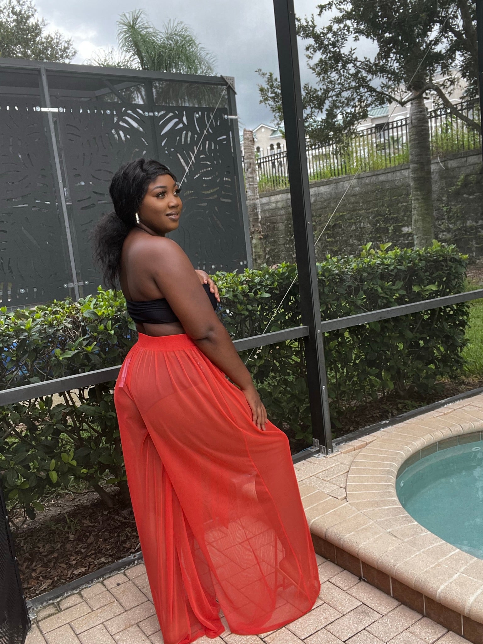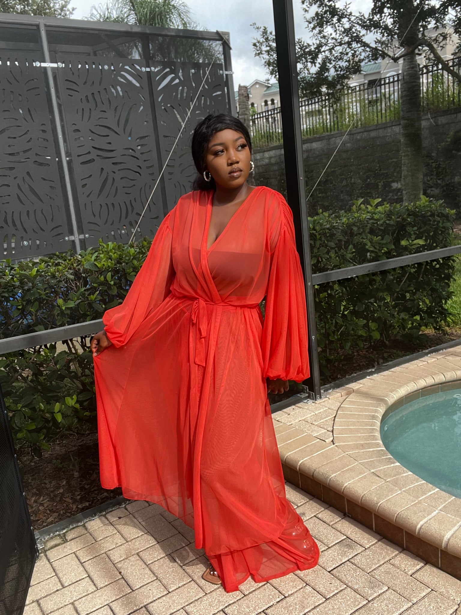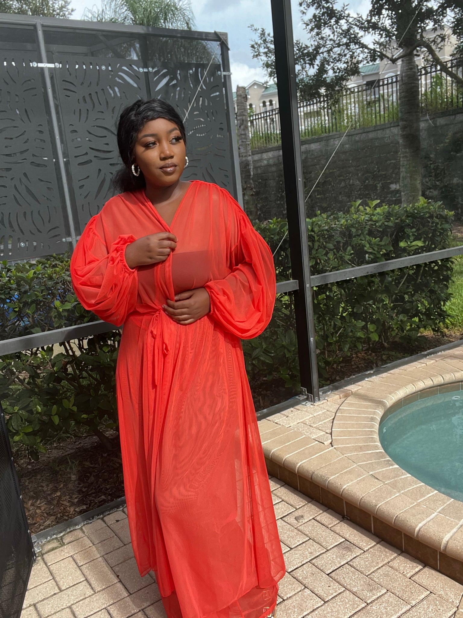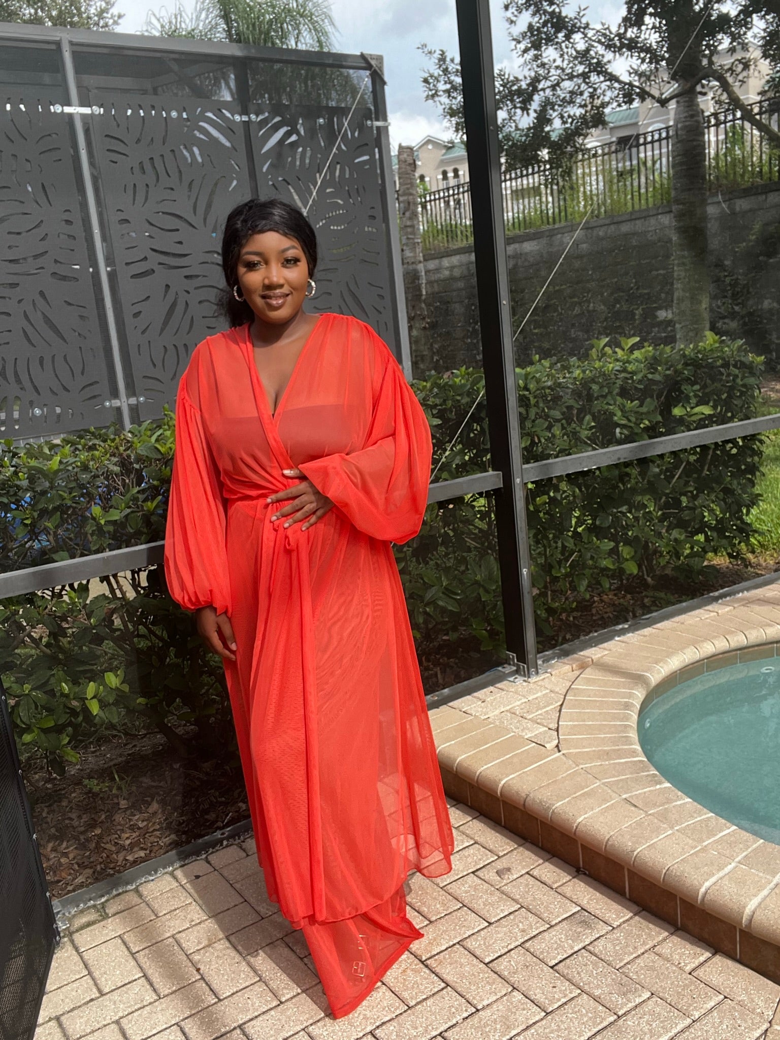 The “Sunrise” pant set is comfortable and feels ultra luxe! We love the long, sheer cardigan and high waisted sheer pants. The cardigan features billowy sleeves and a self-tie closure. The pants are wide leg with no closure. Very stretchy.