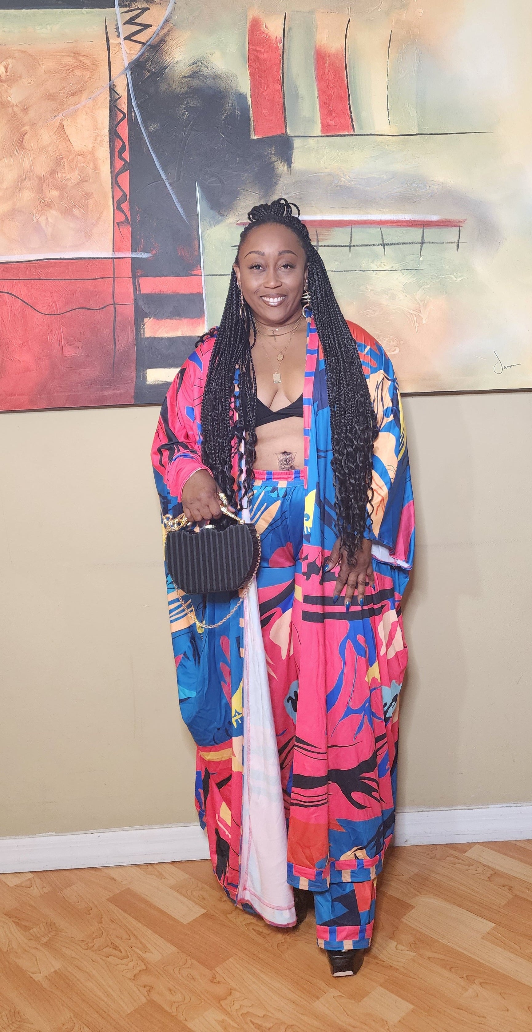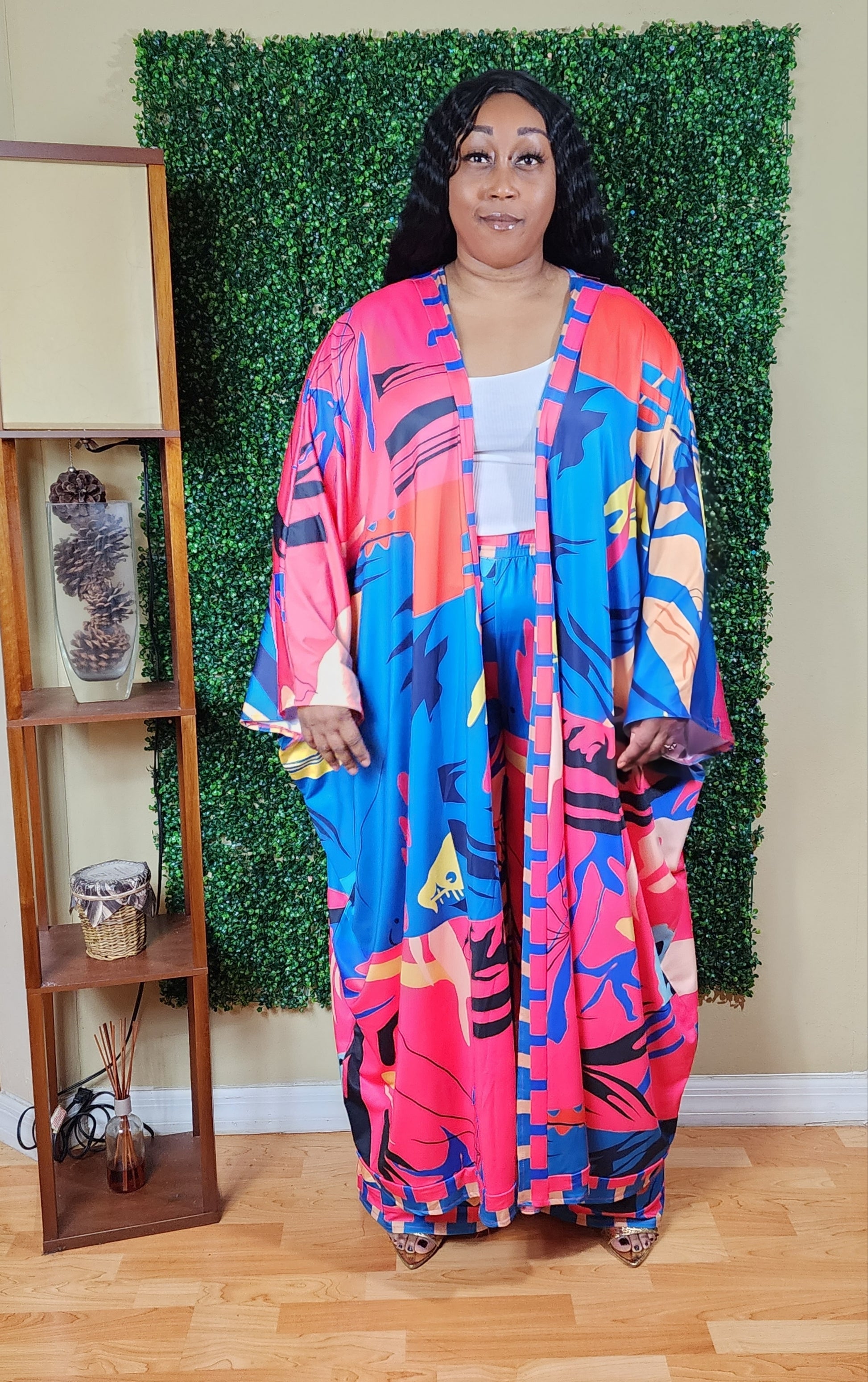 Feel and look like you're on vacay in this two-piece wonder! It features an open, calf/ankle grazing top and matching wide leg pants with elastic waistband. The beautiful print material flows nicely and this two-piece would pair well with various color tops. May we suggest pairing with fitted tees, tank tops, camis, or bralettes?