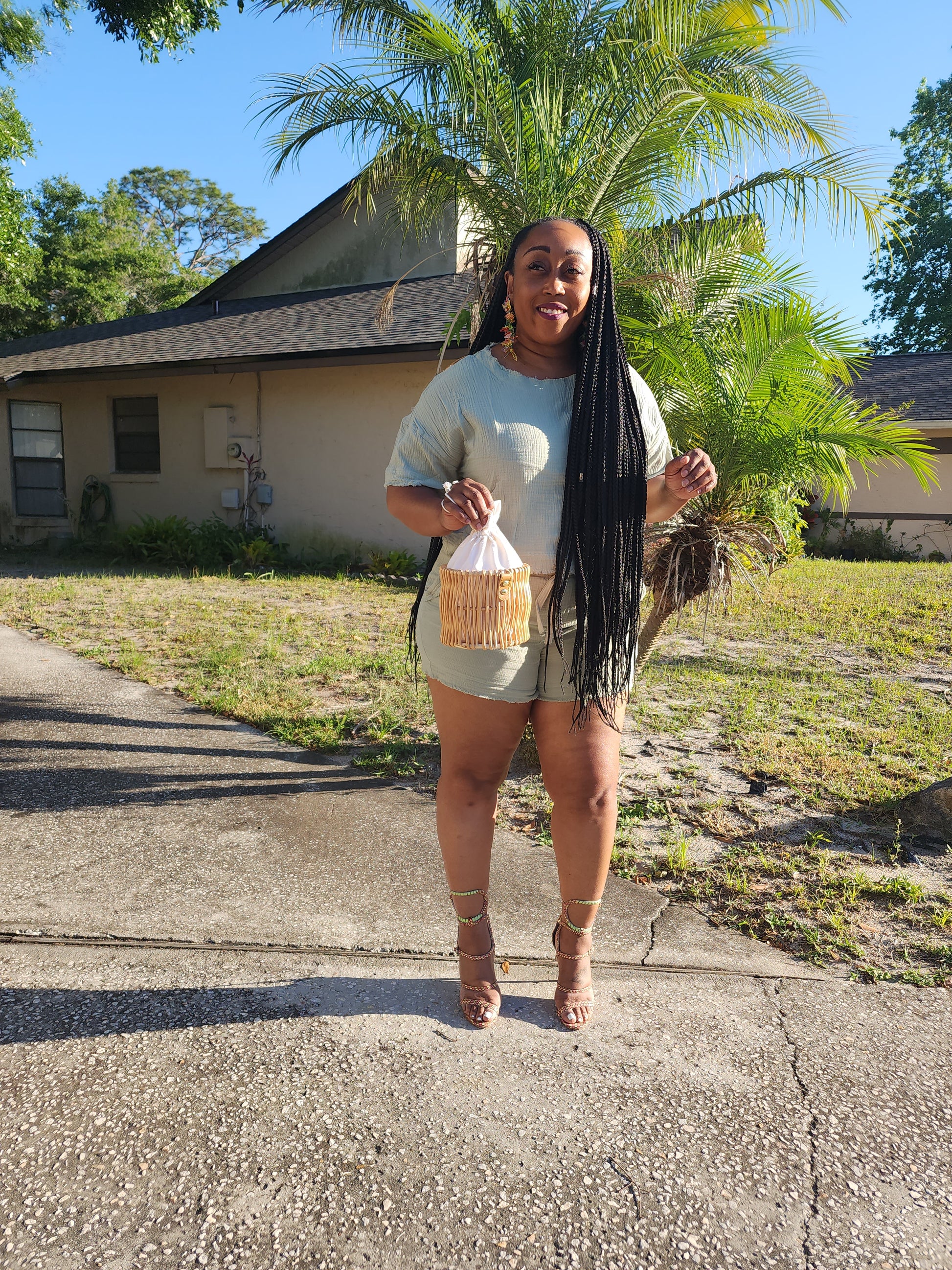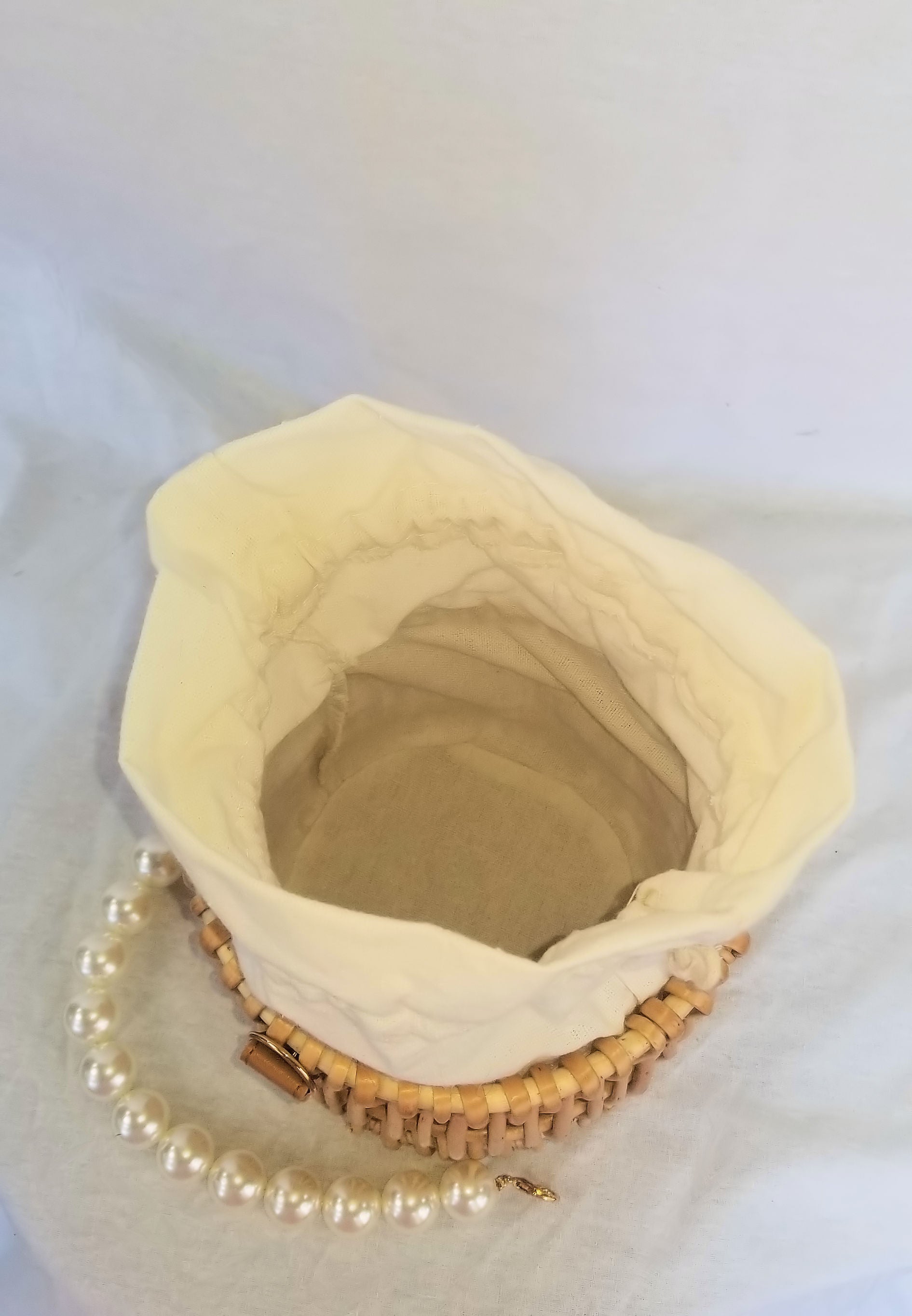 This sturdy, wicker bag is so chic you will want to carry it everywhere! It features an inner bag (not detachable) to help protect your personal items. The bag is closed with a dual drawstring. Carry this cutie with the enclosed pearl strap or via the drawstrings. Available color: Tan