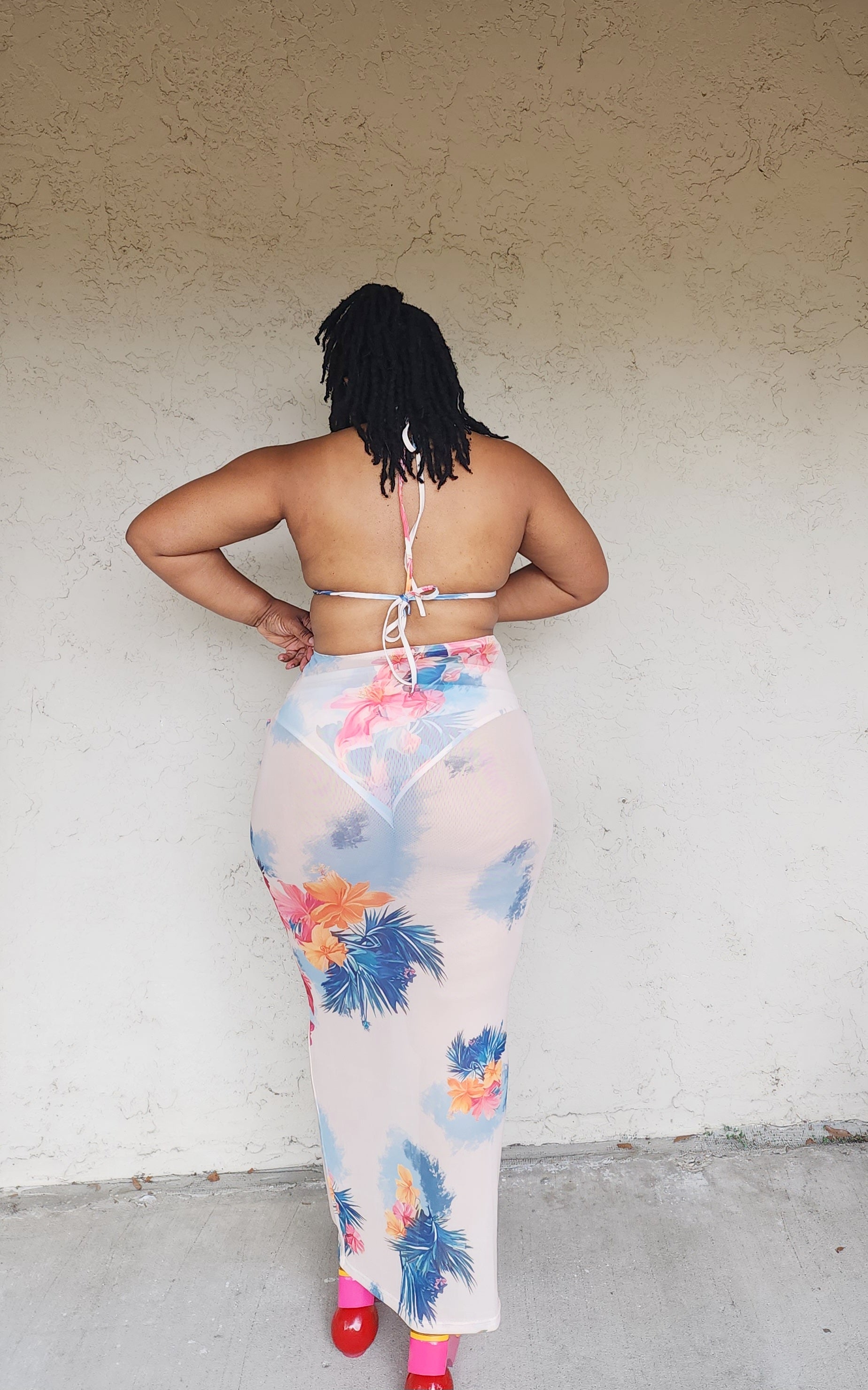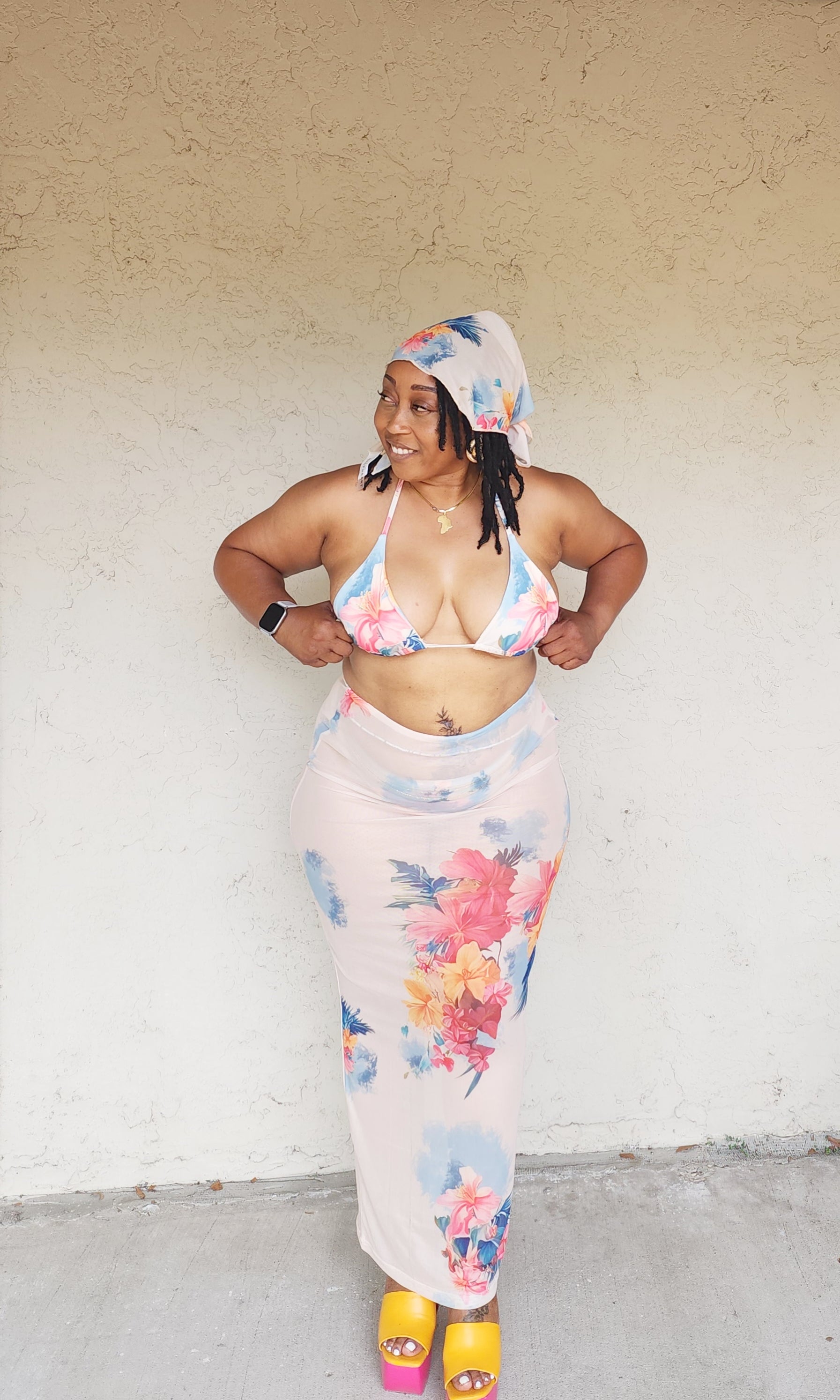 The Togo Swim Set features a scarf, adjustable bikini top, a full coverage bikini bottom, and a high-waisted mesh skirt. It is comfortable and versatile swimwear that you will use over and over again. Very stretchy.