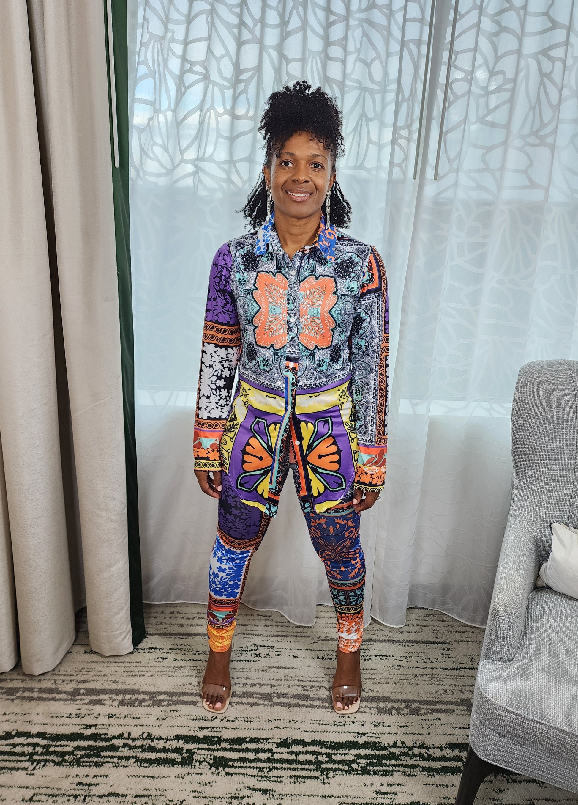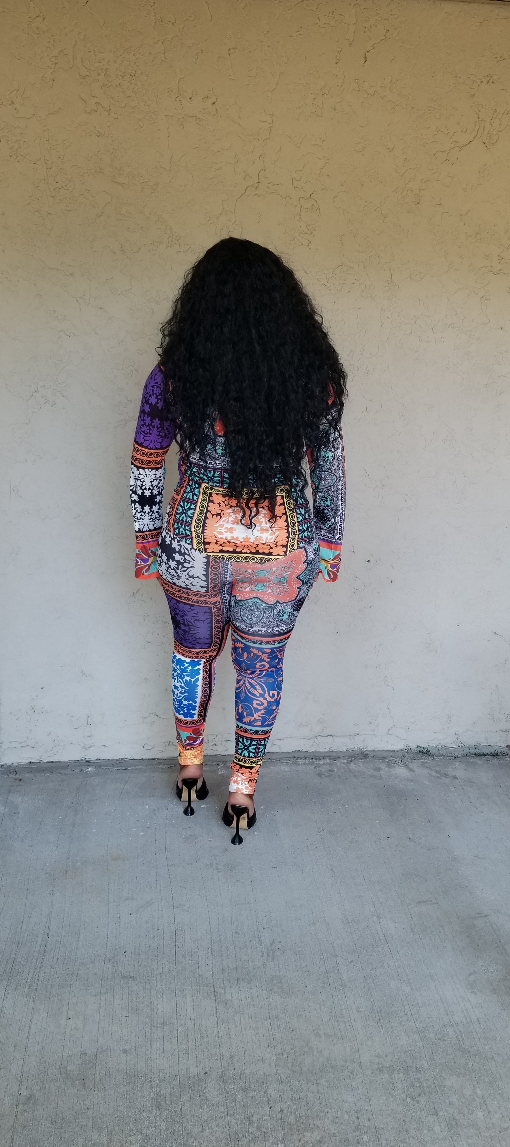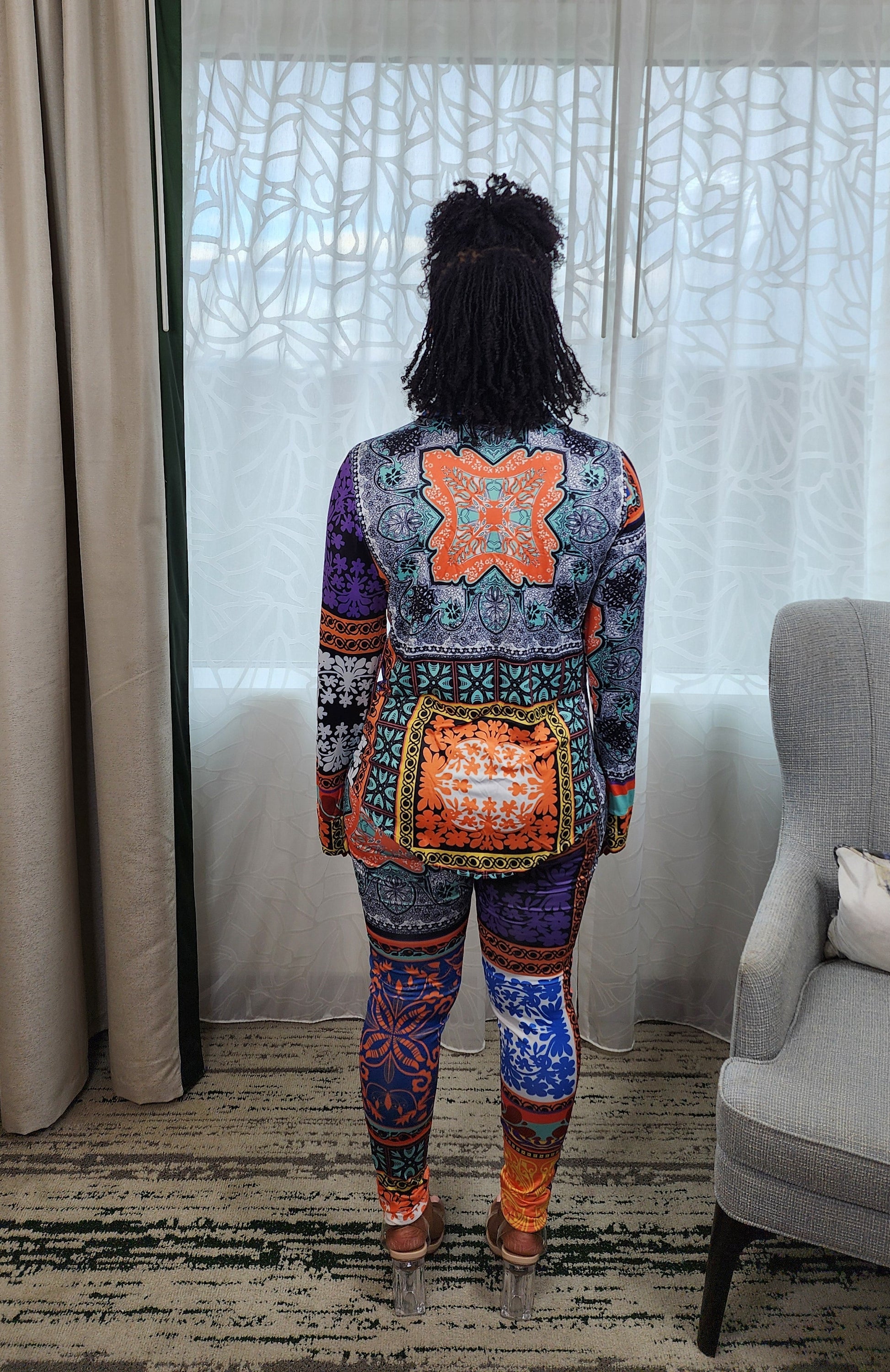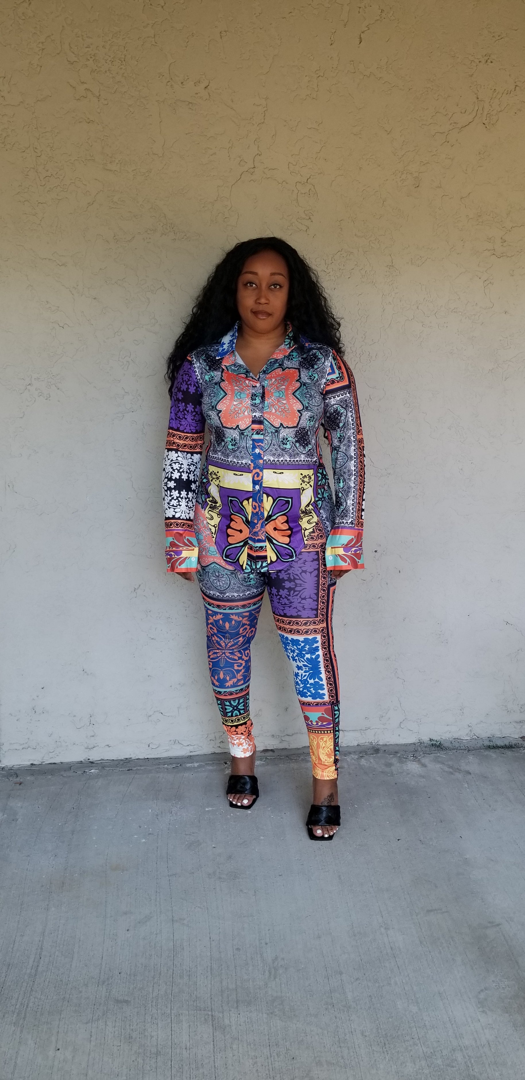 Bold and stylish is the theme for this look. This multicolor set will add an impact to your wardrobe. The top features long sleeves with an oversized button cuff, wide collar, and button down front. The bottom features an elastic waistline and fitted pants with a tapered leg. No closure.